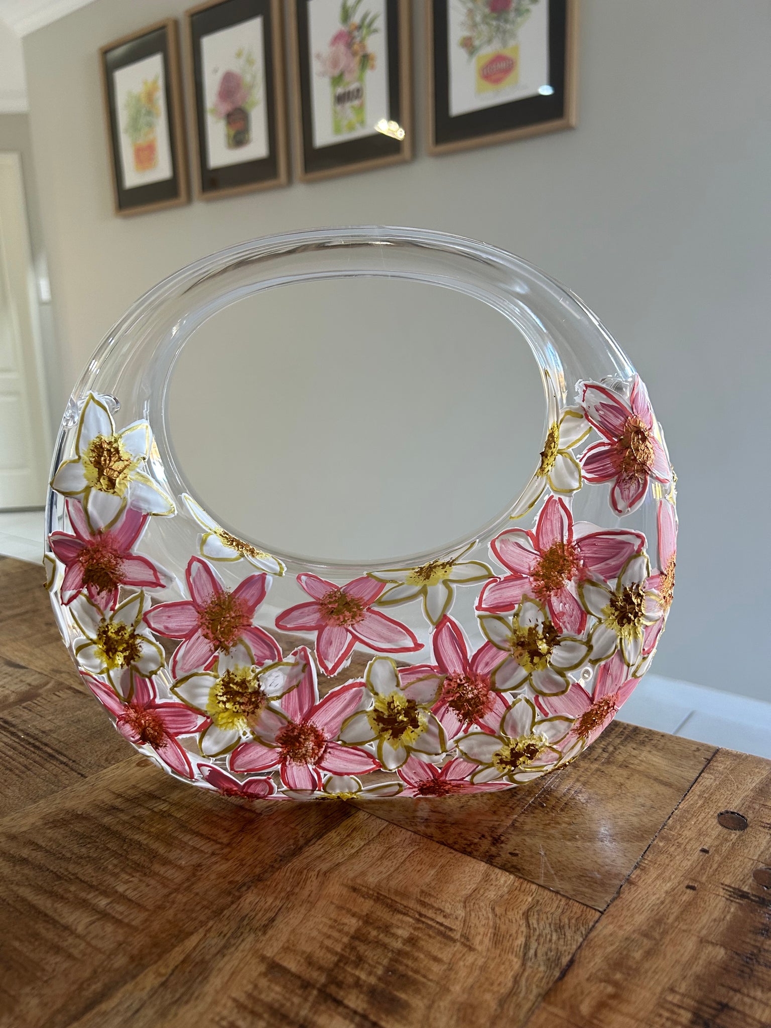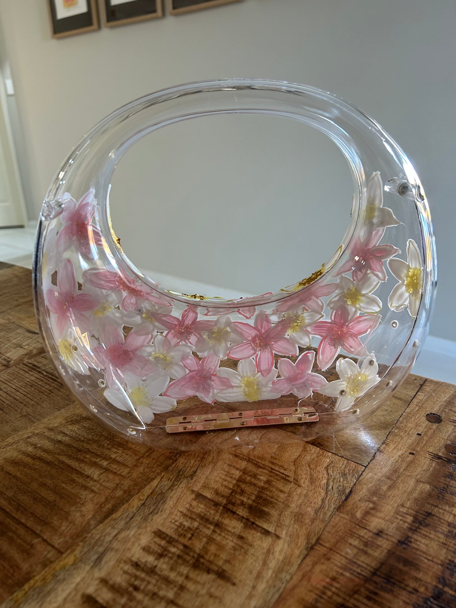 - Material: Clear acrylic body with hand-painted florals